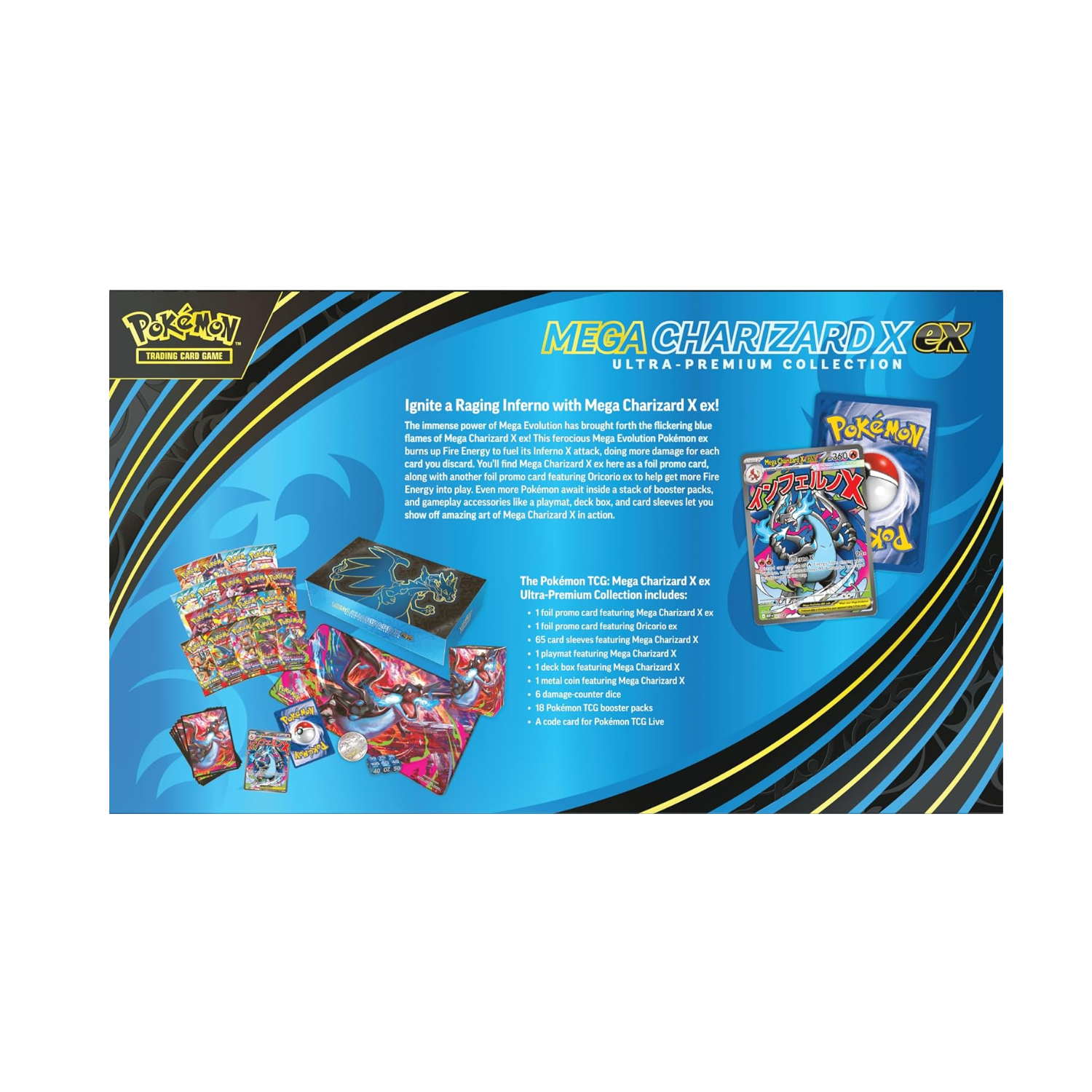 Lleva tu colección a otro nivel con esta Ultra Premium Collection dedicada a uno de los Pokémon más icónicos: Mega Charizard X ex. Una edición de lujo pensada para coleccionistas y jugadores que quieren contenido exclusivo, cartas promocionales impactantes y accesorios de presentación premium.